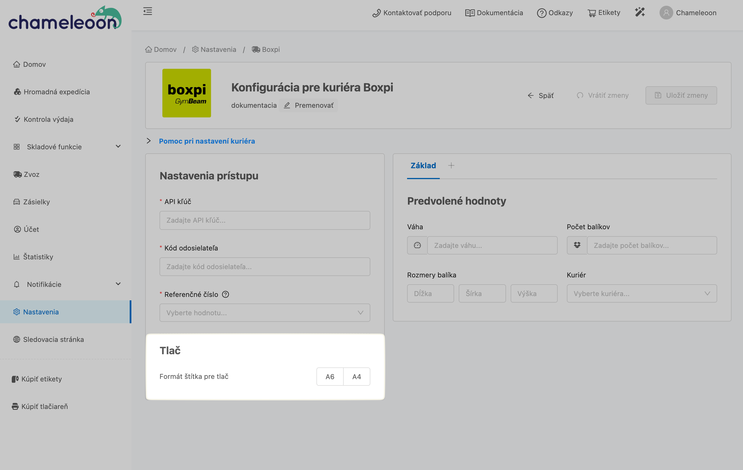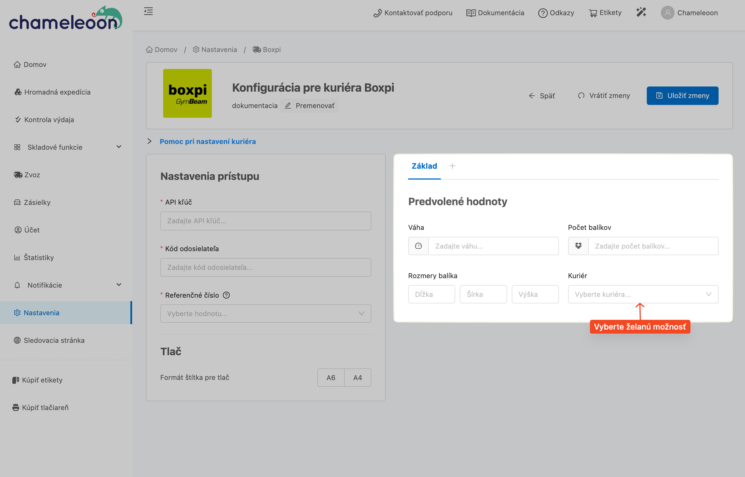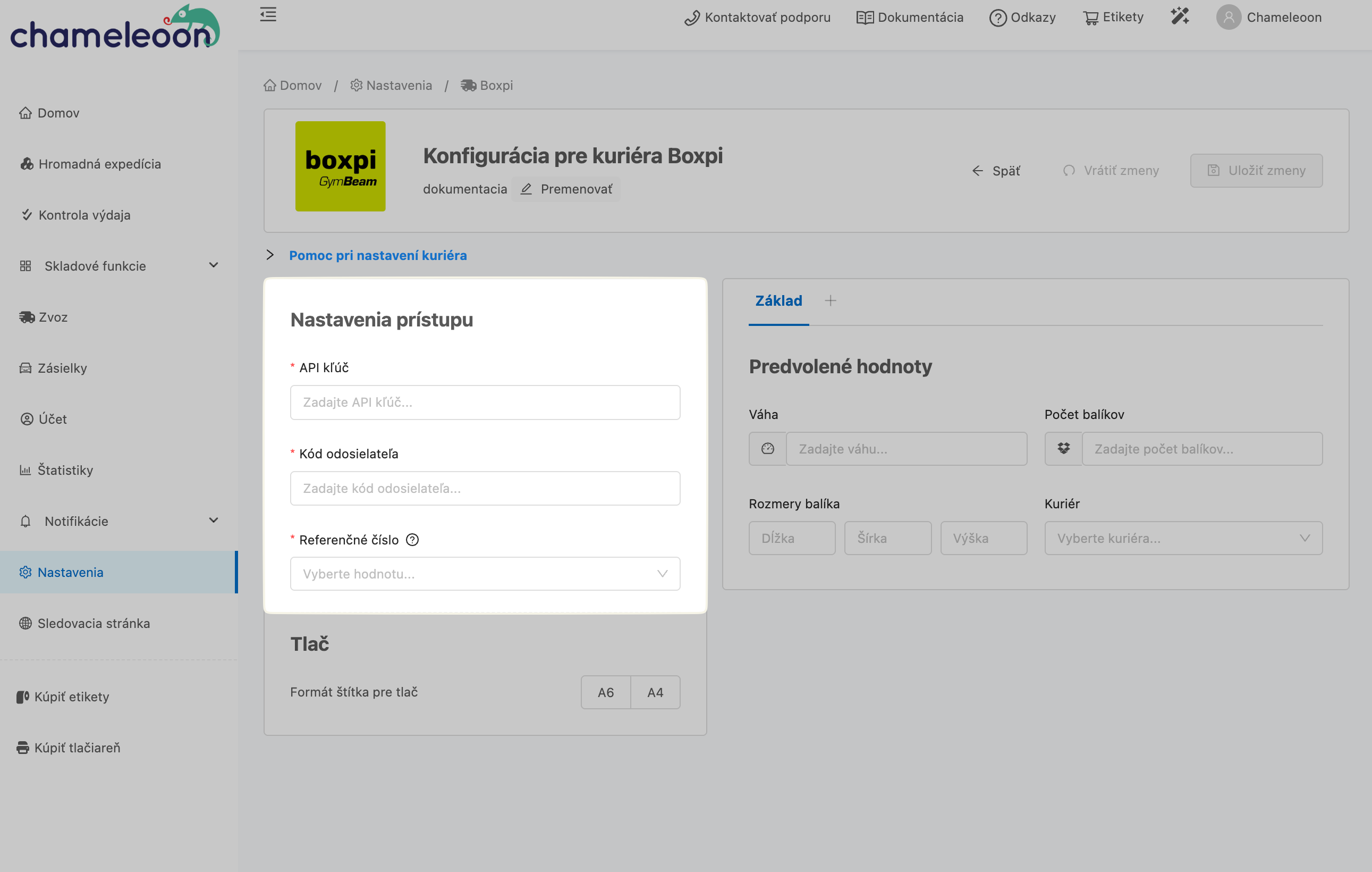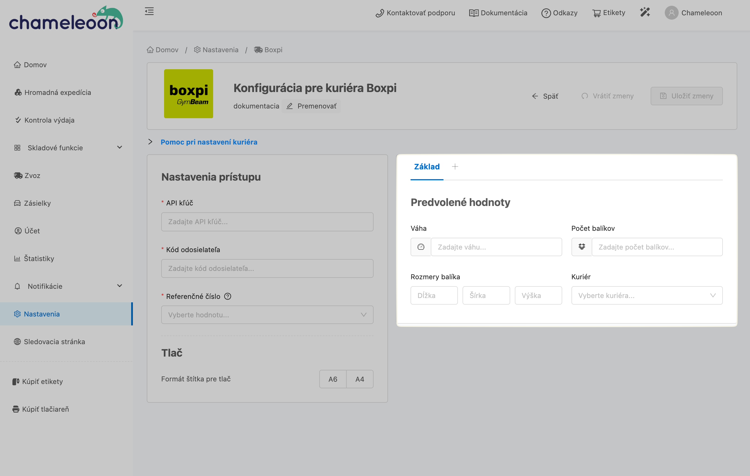 Všetky dôležité nastavenia pre expedíciu alebo tlač štítkov môžete nastaviť v sekcii Konfigurácia pre kuriéra Boxpi.