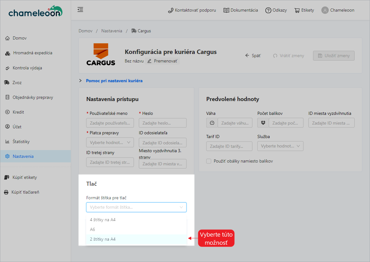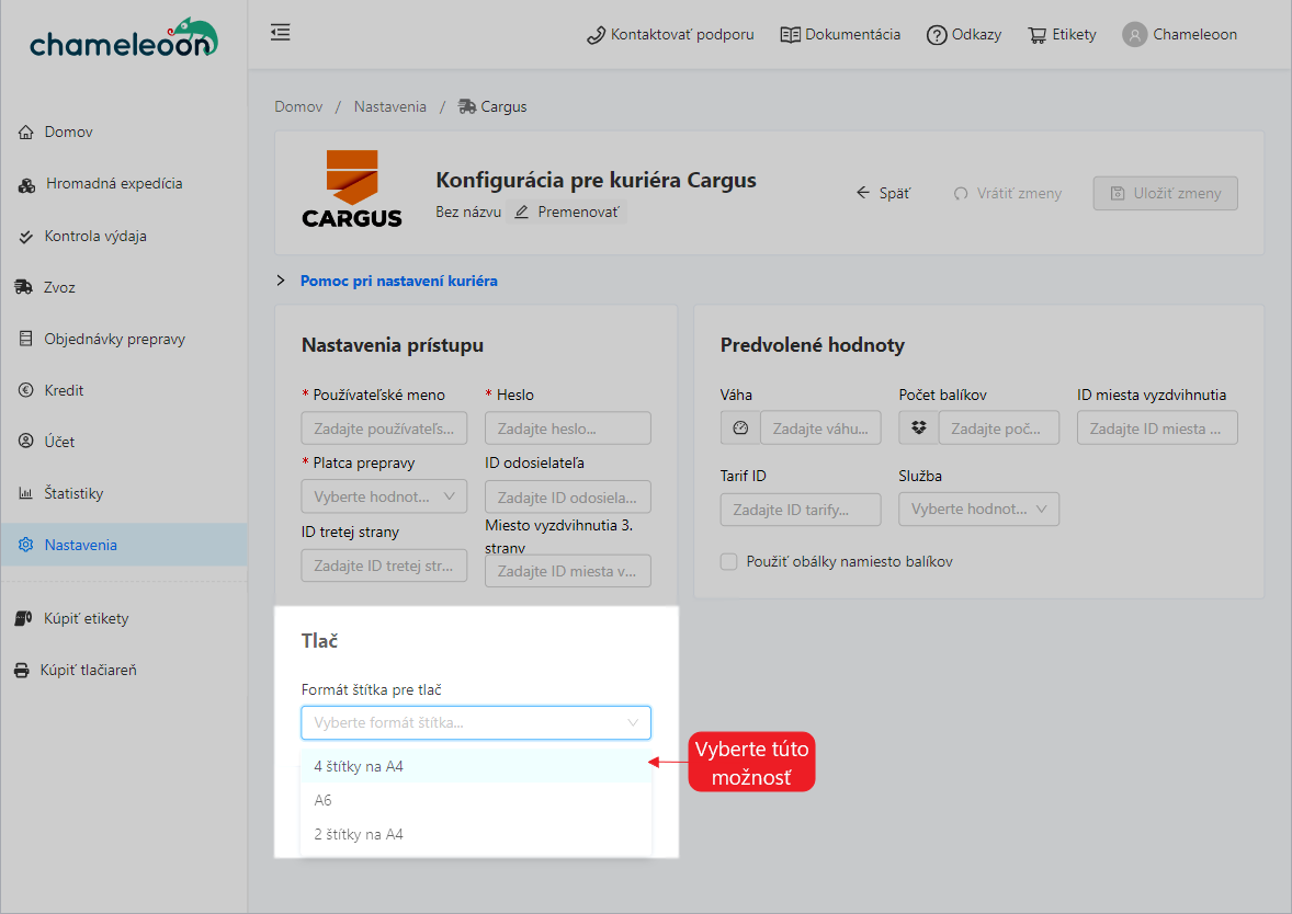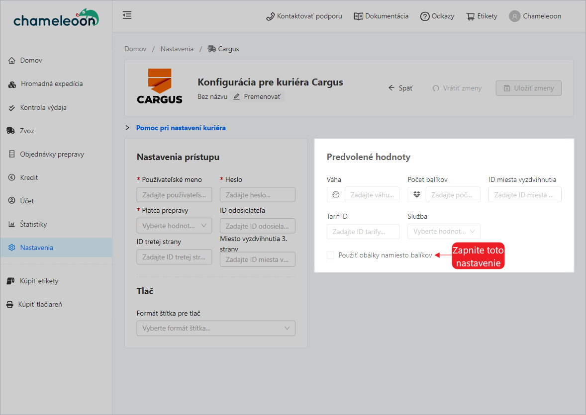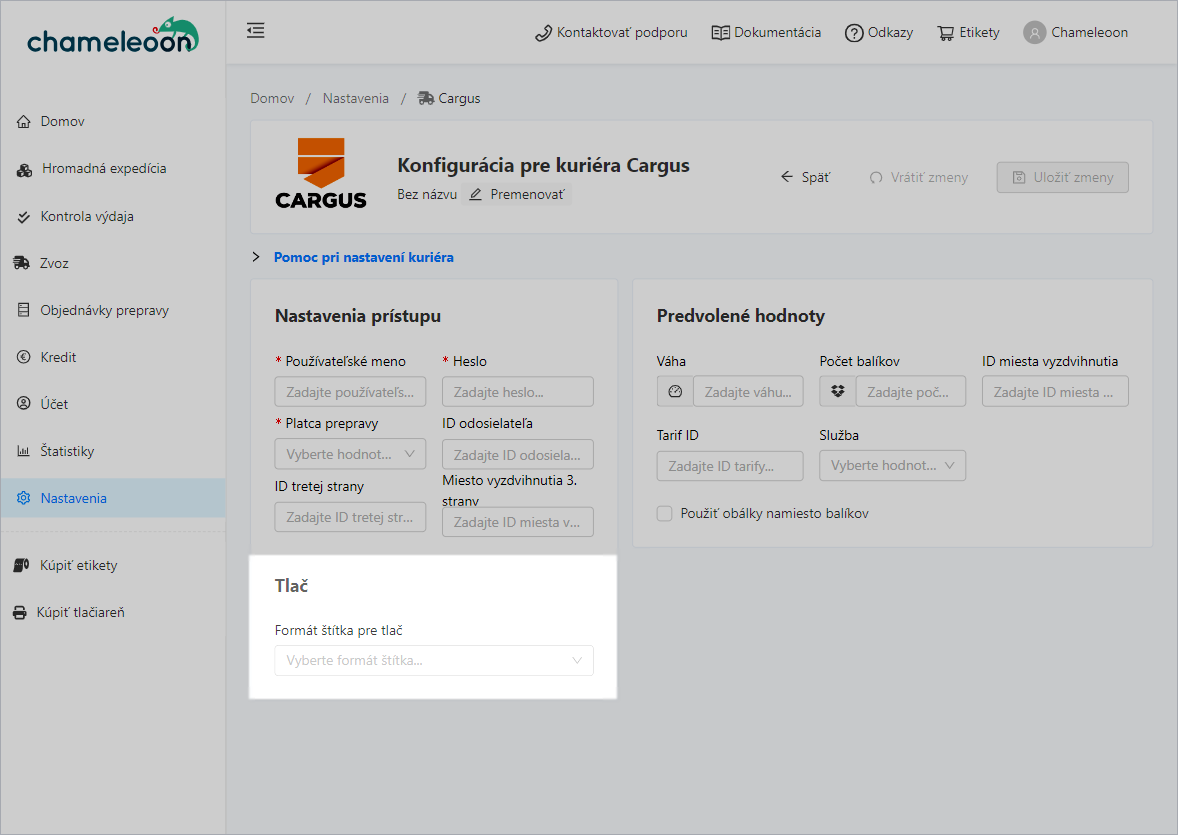 Všetky dôležité nastavenia pre expedíciu alebo tlač štítkov môžete nastaviť v sekcii Konfigurácia pre kuriéra Cargus.