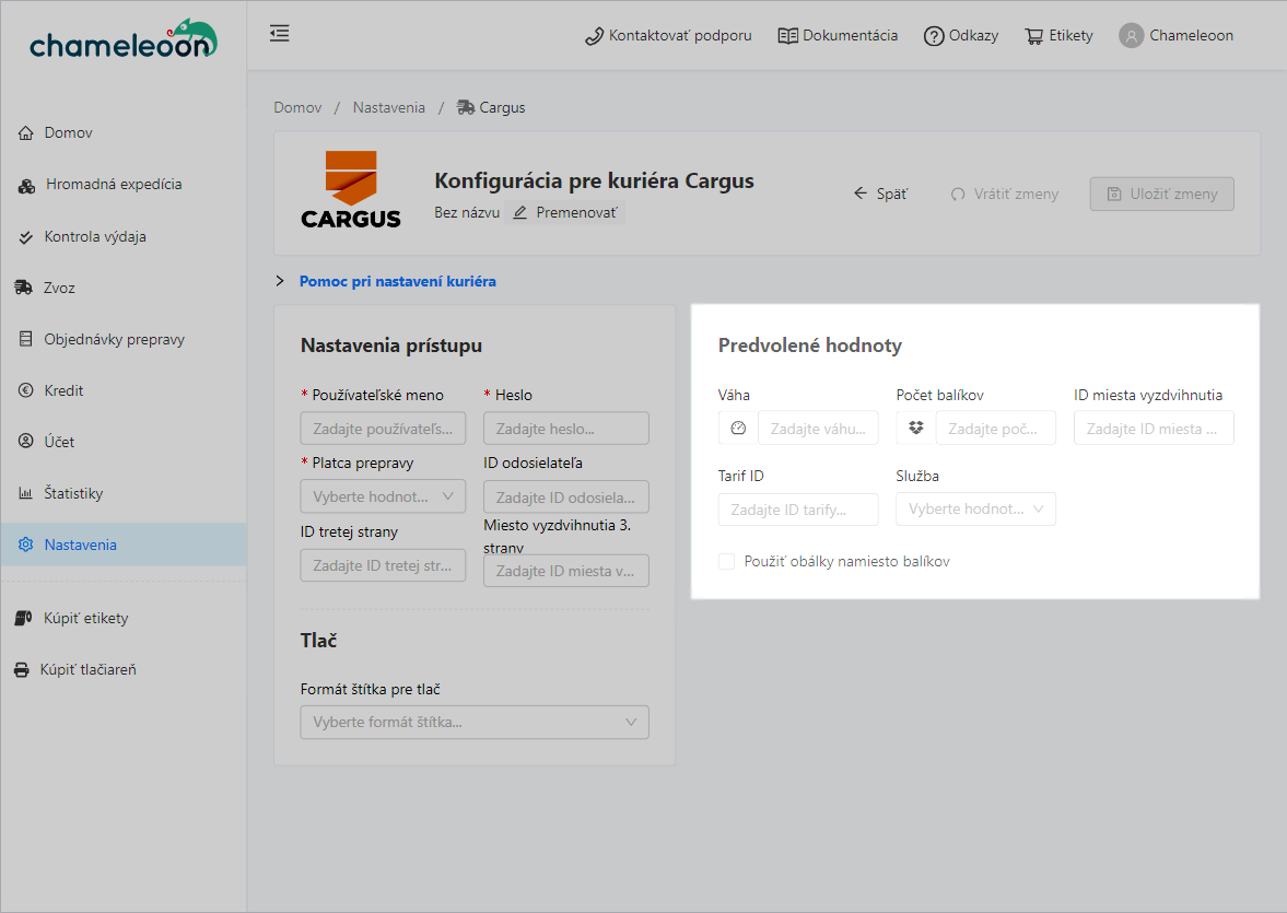 Aplikácia Chameleoon Vám umožní prednastaviť si hodnoty potrebné pre expedíciu tak, aby ste nemuseli pri každej objednávke tieto údaje vypĺňať.