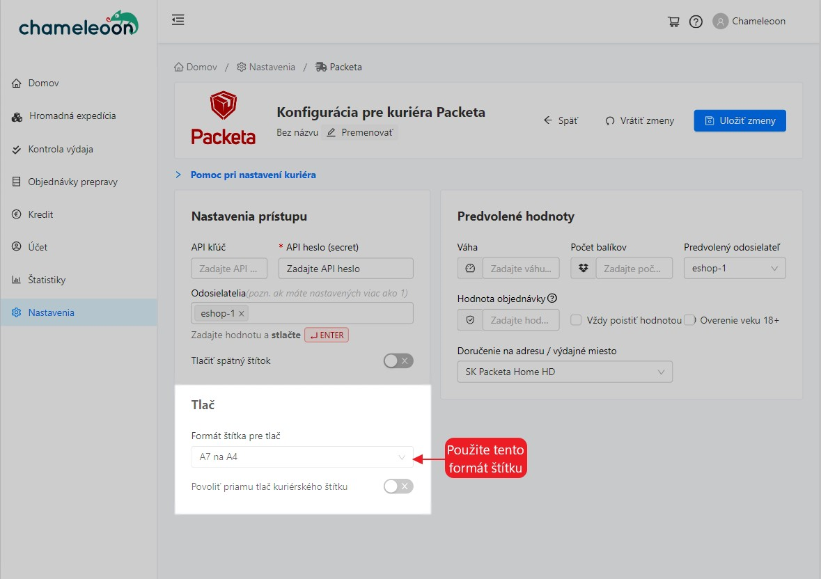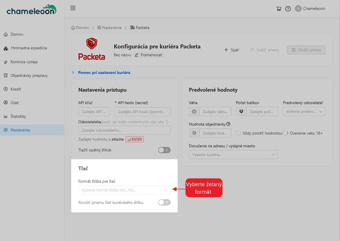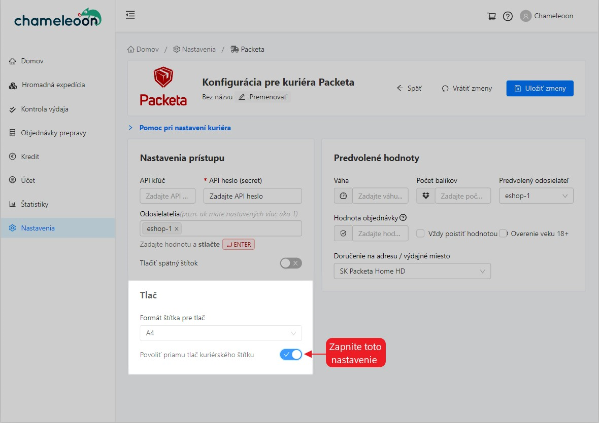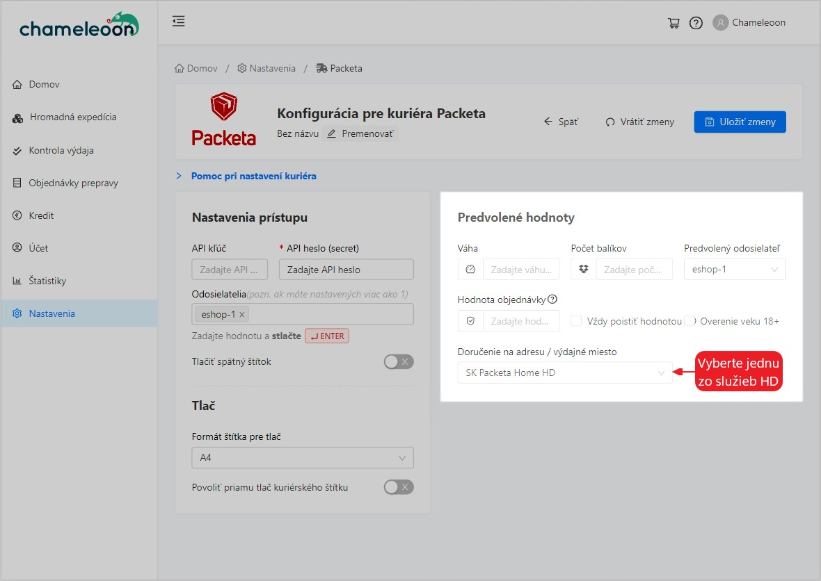 Chameleoon komunikuje s dopravcom Packeta prostredníctvom API Packeta.