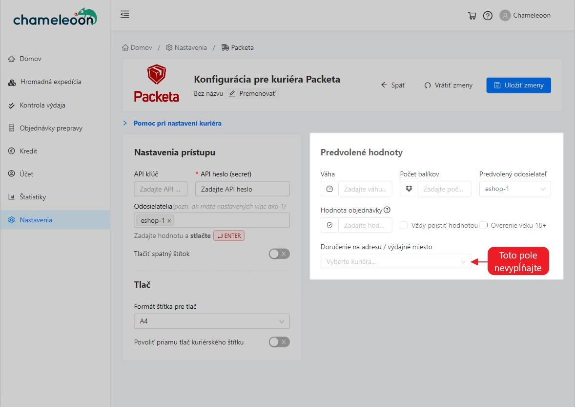 Aplikácia Chameleoon Vám umožní prednastaviť si hodnoty potrebné pre expedíciu tak, aby ste nemuseli pri každej objednávke tieto údaje vypĺňať.