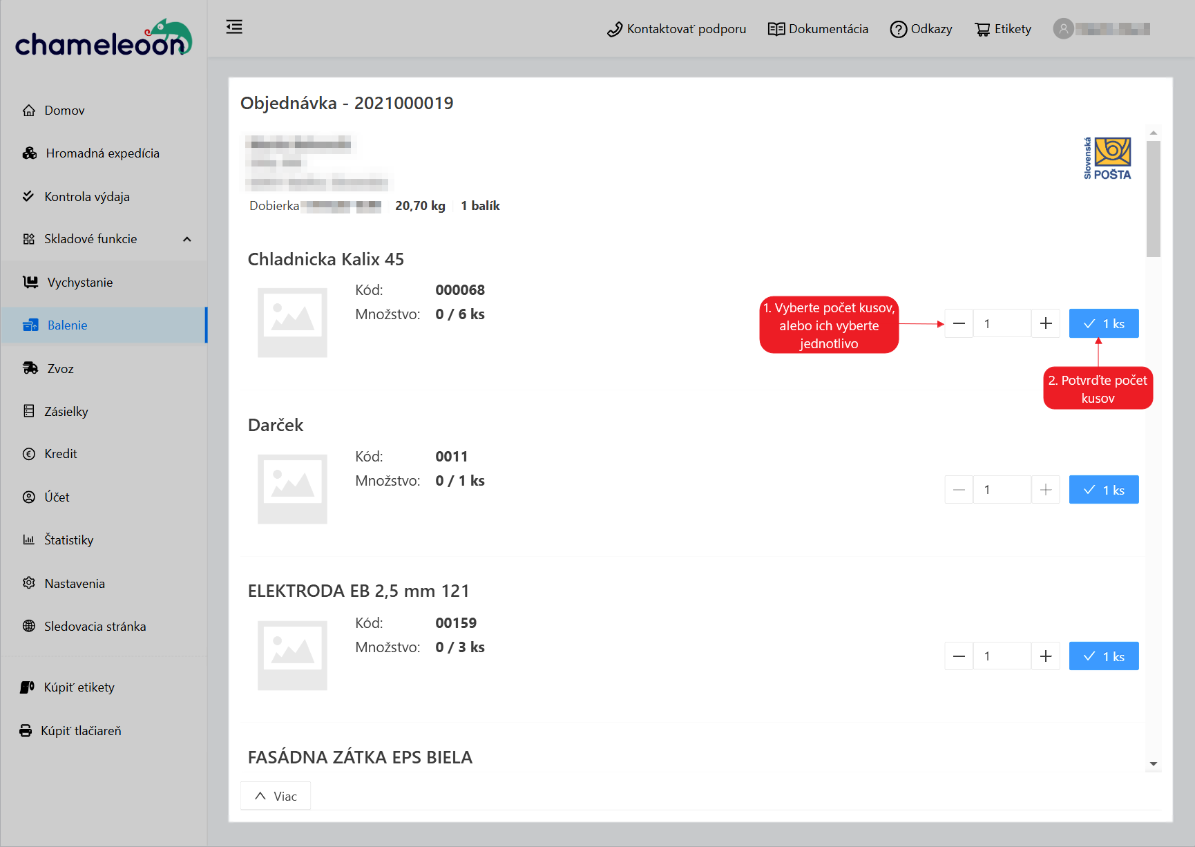Uvedené názorné obrázky sú z počítača, vychystanie a balenie je však prispôsobené aj na telefóny, tablety, či iné zariadenia umožňujúce skenovanie produktov.