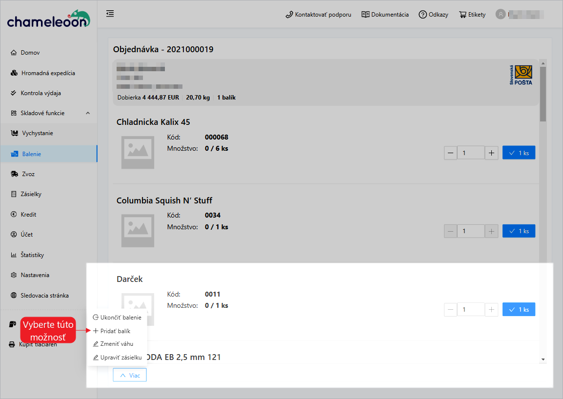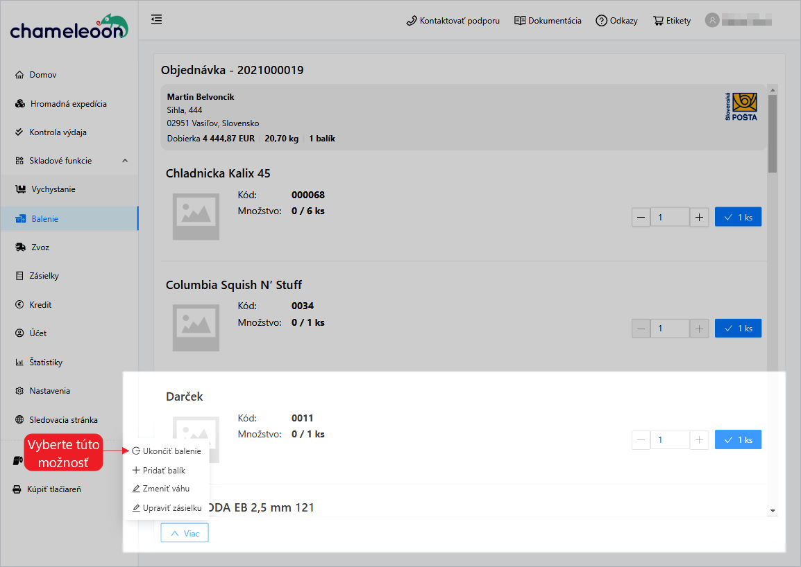 Ak potrebujete ukončiť proces balenia, môžete tak urobiť kliknutím na tlačidlo viac v dolnej časti zoznamu produktov na balenie.K baleniu je možné sa vrátiť výberom danej objednávky z časti Balenie.