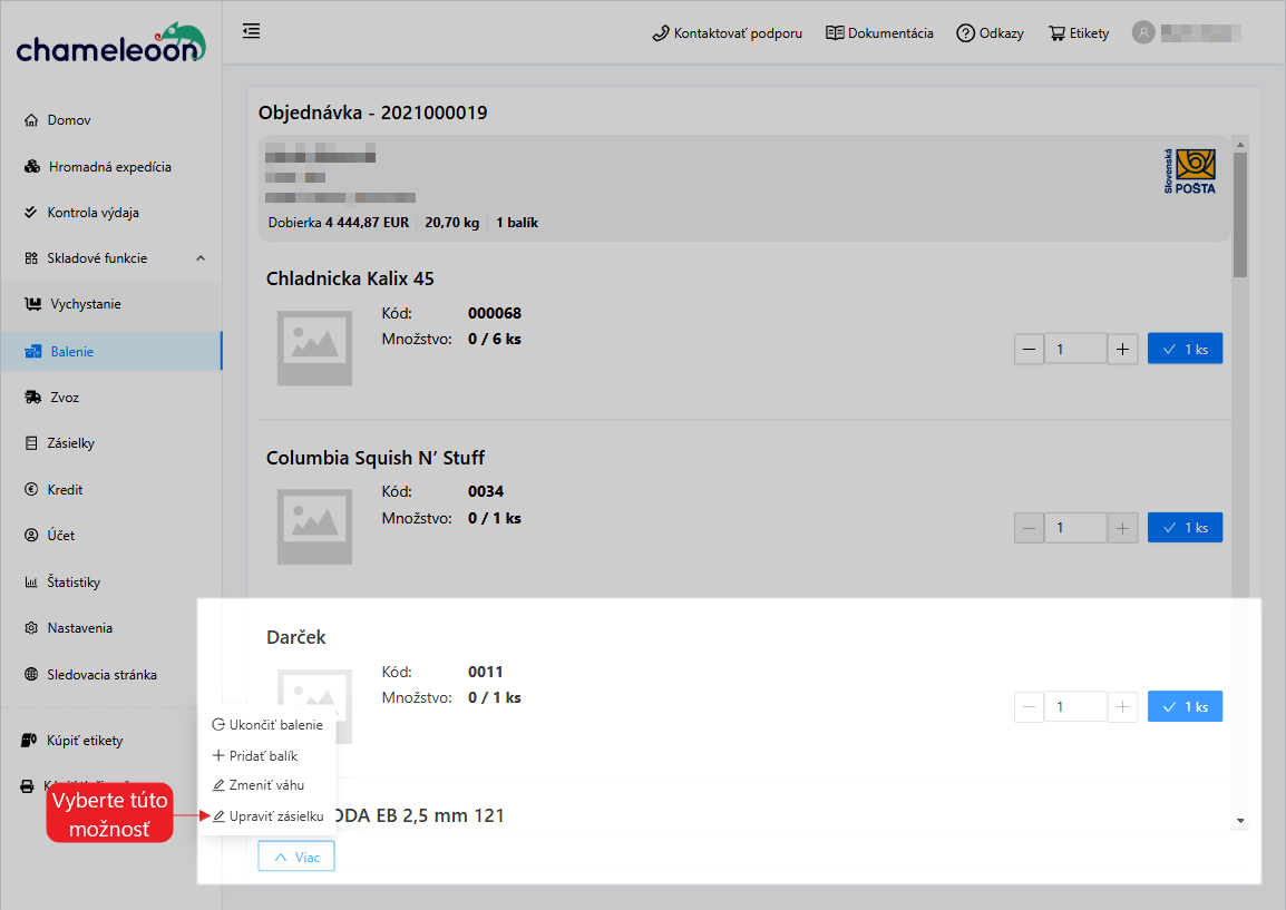 Ak potrebujete zmeniť niektorý z údajov v objednávke, môžete tak urobiť kliknutím na tlačidlo viac v dolnej časti zoznamu produktov na zabalenie.Po kliknutí na tlačidlo upraviť zásielku budete presmerovaný na formulár týkajúci sa danej objednávky.