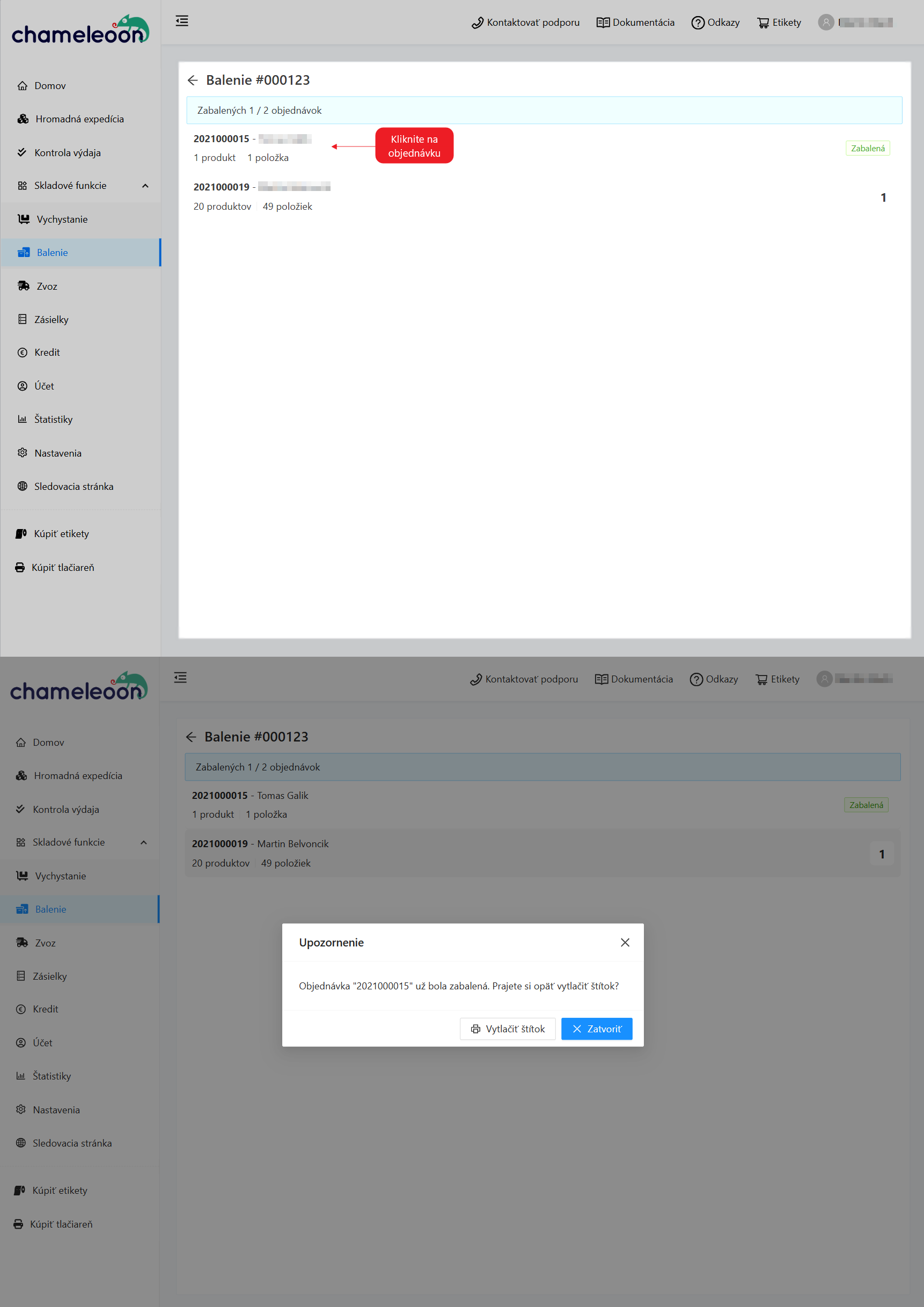 V prípade, že dôjde počas tlače k chybe, alebo sa štítok poškodí, môžete nový štítok vytlačiť kliknutím na objednávku so statusom zabalená.