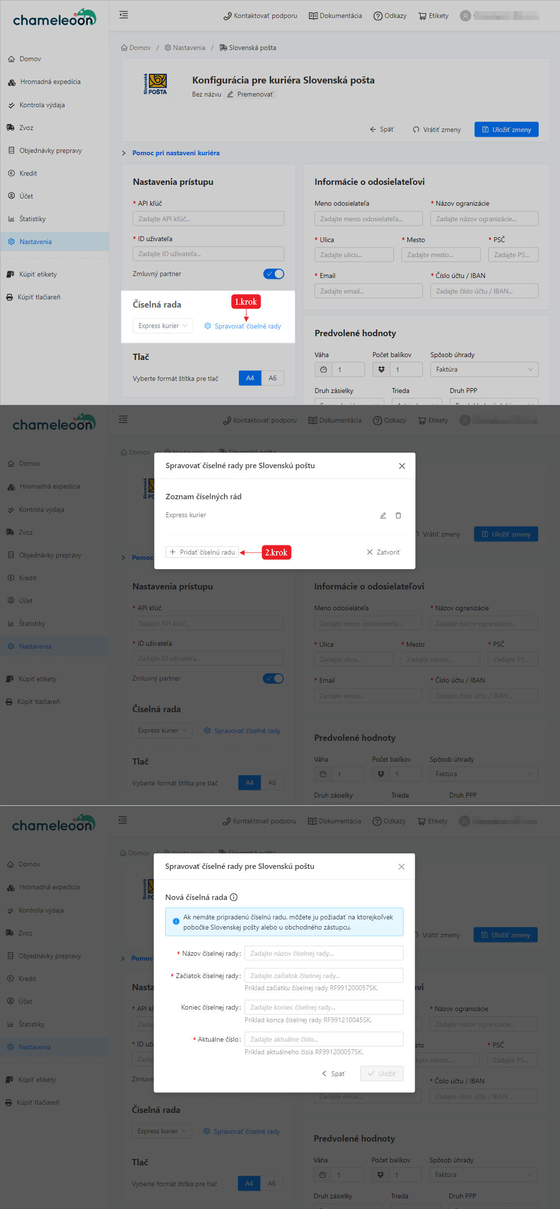 Pre tlač štítkov v aplikácií Chameleoon pre dopravcu Slovenská pošta je potrebné mať pridelenú číselnú radu. Bez číselnej rady nie je možné tlačiť priamo z aplikácie, ale je potrebné tlačiť štítky z portálu EPH.