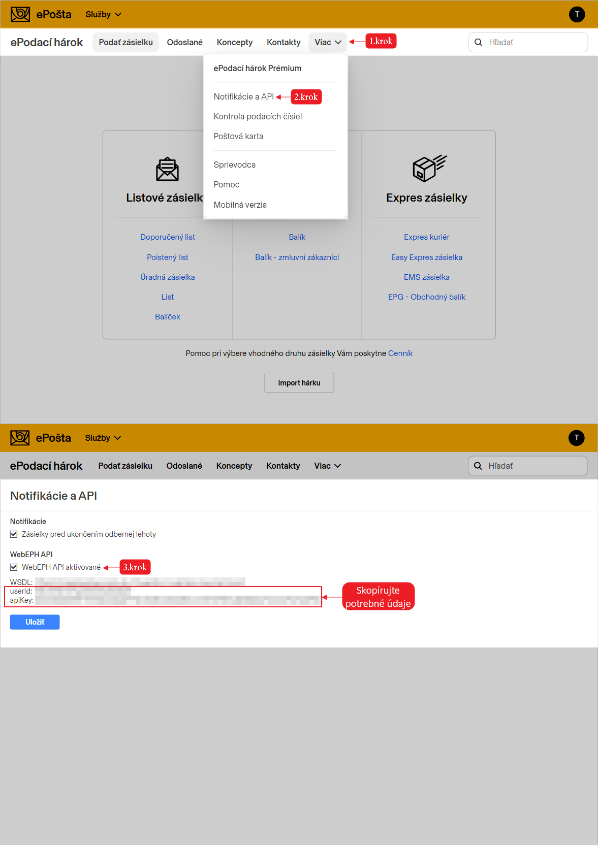 - Získať prístupové údaje UserID a ApiKey - Tieto údaje nájdete po príhlásení do systému EPH. Systém EPH: https://eph.posta.sk. Údaje nájdete po prihlásení do systému v nastaveniach pre notifikácie a API.