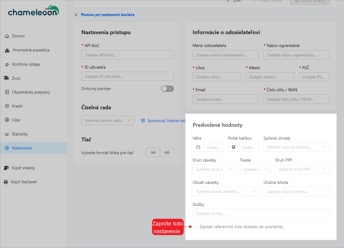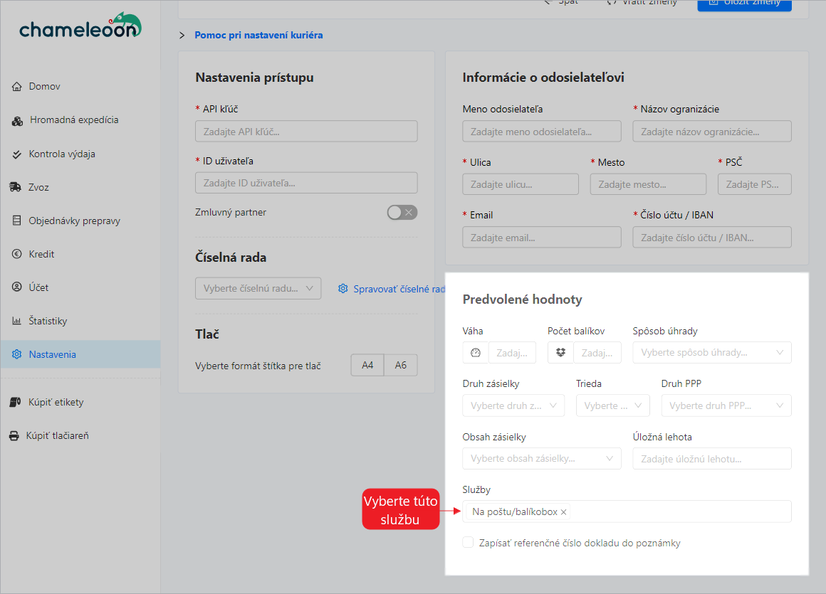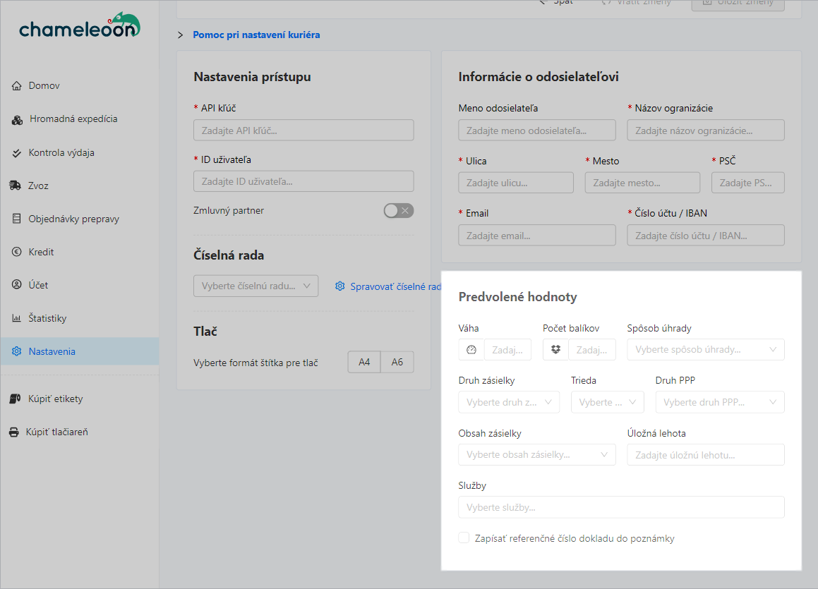 Aplikácia Chameleoon Vám umožní prednastaviť si hodnoty potrebné pre expedíciu tak, aby ste nemuseli pri každej objednávke tieto údaje vypĺňať.