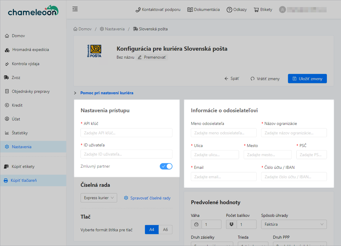 Všetky dôležité nastavenia pre expedíciu alebo tlač štítkov môžete nastaviť v sekcii Konfigurácia pre kuriéra Slovenská pošta.